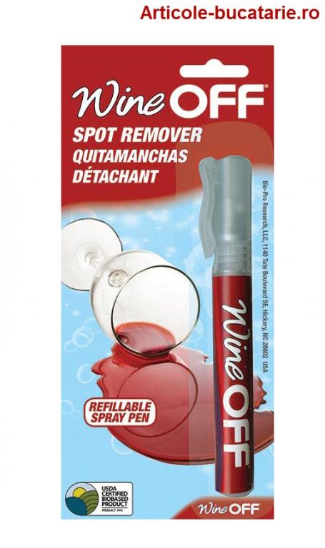 Wine Off stilou este un spray destinat indepartarii petelor de vin rosu, precum si a altor pete organice aparute accidental. Se utilizeaza prin pulverizare pe pata de vin, dupa care se asteapta 5 min pentru actiunea acestuia. Se spala (tamponeaza) cu apa si detergent, iar apoi se clateste numai cu apa.